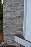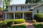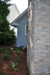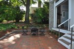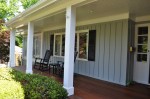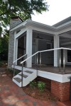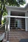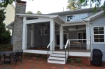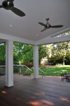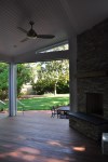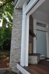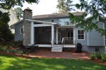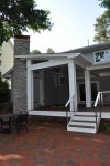 The screened porch living space ties in nicely with the taller gable roof. A vaulted ceiling and a large natural stone fireplace creates a warm and inviting area for the family and their guests through most of the year. The screens are mortorized so that the porch can be open during the months without those pesky mosquitos and screened when needed. This also helped us maximize the views from inside to the backyard and get as much daylight inside the house as possible. The dining section of the porch tucks under the second floor master bedroom windows and ties in with the shorter gable form. The ceiling in this area is flat and creates a cozy area right off the kitchen for eating outside. The ipe flooring continues out to the uncovered portion of the porch and carries down the stairs to a new brick patio with stone retaining walled natural areas. All plants in these areas have been chosen for their love of low light levels.